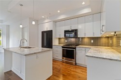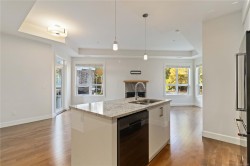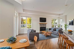 Experience elevated coastal living in this luxurious 2 bed, 2 bath condo with forest-framed ocean views at the sought-after Pacific Landing. Thoughtfully designed with overheight ceilings, a gas fireplace, heated bathroom floors, and a gourmet kitchen with quartz countertops, gas range, and large island for prep and entertaining. The covered balcony with gas BBQ hookup extends your living space outdoors, perfect for year-round West Coast enjoyment. The serene primary suite offers a walk-in closet and spa-style ensuite, while a full laundry room adds rare functionality. Secure underground parking, storage locker, and modern construction ensure peace of mind. Surrounded by walking trails, community gardens, and just steps to the sandy Esquimalt Lagoon, this vibrant seaside community sits minutes from Royal Roads University, Hatley Castle, the Galloping Goose Trail, and everyday amenities. A perfect blend of nature, luxury, and convenience — West Coast living at its finest.