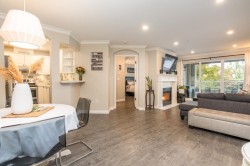 Westham Lane is one of Ladner’s most sought-after buildings, known for its prime location, lifestyle convenience, and exceptional upkeep. This contemporary 2-bed, 2-bath home features a smart split-bedroom layout and was refreshed in 2018 with vinyl plank floors, crown moulding, updated lighting and paint throughout. The spacious kitchen offers quartz counters, new hardware, and updated appliance package. Enjoy a spacious living area with cozy gas fireplace and walk-out covered patio. Washer/dryer 2025. Recent building upgrades: balconies (2020), sloped roof (2022), and boiler (2023). Amenities include a large party room with kitchen and gym with new equipment. 2 parking + storage. 2 pets allowed (dogs to 16” at shoulder). Ladner Elem and DSS. Steps to Ladner Centre.