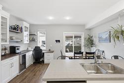 Up one level, the bright and open kitchen and dining area flows onto a south-facing patio, ideal for morning coffee or sunny afternoon relaxation. The kitchen features a custom upgrade by Kitchen Studio completed in 2024, thoughtfully designed with a built-in coffee bar, wine fridge, and office nook—blending function and style for modern living. The living room features large picture windows that frame the sweeping northern views, making the space feel open and airy. A generous 2-piece bathroom completes this floor.