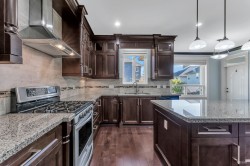 Luxurious home in Yorkson South! Featuring a gourmet kitchen with granite counters, large island with built-in drawers, custom maple cabinets, S/S appliances & gas stove. Main floor offers a spacious office/living space with wainscoting, plus a bright family room with gas fireplace, custom built-ins & engineered hardwood floors. Upstairs includes a primary suite with walk-in closet & organizers, ensuite with jacuzzi tub, granite counters, maple cabinets, separate showers & mountain views. Radiant heat, designer lighting & crown mouldings throughout the top two floors. Basement includes media room & 2-bed legal suite with new laminate flooring. Close to Lynn Fripps Elementary, parks & shopping.