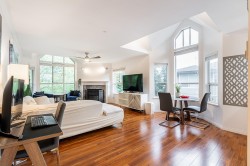 Welcome to Cambridge Court, a spacious top-floor corner home offering 1,228 sq. ft. of bright and airy living. Vaulted ceilings and oversized windows fill the space with natural light, while the east-facing balcony is perfect for your morning coffee or relaxing after work. This well-maintained 2 bedroom, 2 bathroom layout features a generous living and dining area, cozy gas fireplace, full-size laundry room, and heated bathroom floors for year-round comfort. The proactive, well-managed strata includes gas and hot water in your maintenance fee. Ideally located within walking distance to shopping, restaurants, parks, and transit, just minutes from the future SkyTrain station. One secure underground parking stall included. Move-in ready, book your private tour today!