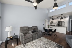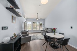 TOP FLOOR, VAULTED CEILINGS! Beautifully bright and sunny south exposure! Downsizer alert! This is the unit that you've been waiting for! Downsize in safety and comfort in this 2BDRM 2 BATH condo, with one occupant needing to be 55+ in age. Up to 13'ft vaulted ceilings! White kitchen cabinetry, S/S appliance package incl gas stove, granite counters. Heated ensuite tile floor in the master bath. 2nd Bdrm with cheater ensuite/main bath. Updated laminate floors and newer carpet in bdrm’s. California shutters. Updated paint and lighting throughout. BONUS storage locker on the same floor and 2 side by side parking stalls. Secure bike storage, fitness room and clubhouse included!NEW Heatpump offering A/C!