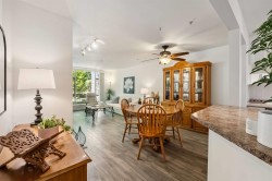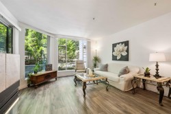 Welcome to River Gardens! This stunning 1,178 sq ft 2 bed + den, 2 bath home has been freshly painted and features elegant LVP flooring throughout. The bright kitchen offers ample white cabinetry, generous counter space, newer stainless appliances, & a pass-through eating bar to the dining area. Enjoy large picture windows and a private 250 sq ft covered deck backing onto a peaceful greenbelt. The spacious primary bedroom has double closets, a 4-piece ensuite, and direct deck access. The second bedroom is generously sized, with a 3-piece bath including walk-in shower, just steps away. Bonus den is ideal for a home office. Includes in-suite side-by-side laundry, in-suite storage room. One parking & one locker. Steps to West Coast Express!