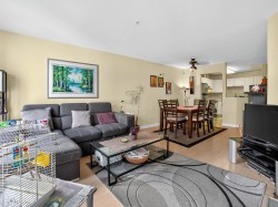 Welcome to Kingsgate Court in uptown New West. This inside corner unit opens up to laminate wood floors in the foyer, running to the dining room and living room with a gas fireplace and sliding glass doors that step out to the covered balcony, accessed as well from both bedrooms. The open kitchen has a breakfast bar opposite the stainless steel appliances and double sink. In suite storage sits adjacent to the hall closet. The three-piece main bathroom sits across the hall from the second bedroom. The primary bedroom, enjoying the same green belt, courtyard views from the deck and living room, has double mirrored closets on the way to the en suite and stacked washer and dryer. 2 cats/dogs allowed.
