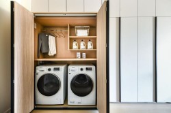 DEVELOPER FINAL HOME. Discover hue by Marcon, a community nestled in Port Moody, surrounded by nature and complete with modern conveniences for contemporary living. This south-facing, top-floor 1 Bedroom home features 35 feet of linear custom millwork storage designed to maximize space. The kitchen is outfitted with a sleek Liebherr refrigerator, Fulgor dishwasher, and AEG gas cooktop with a seamlessly integrated speed oven. A built-in dining table for four makes entertaining effortless, while the side-by-side washer and dryer—with a folding table, extra storage, and overhead drying rod—adds everyday convenience that is typically found in a single-family home. Step out onto your private balcony and savour serene views of the tranquil courtyard and surrounding natural forest of Port Moody.