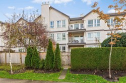 Derby Downs. Large 1 bedroom & den condo with street access from living room which opens onto a large fenced yard with a gate. Your own backyard with lots of street parking right in front, on the very quiet street. Quiet space across the street. Mostly updated with newer flooring, large kitchen, Ceasar counter tops, s/s appliances, lighting cabinets, sinks faucets, hood fan and more. Laundry has a barn door. Great building with rain screening completed in 2011 and new roof in 2019. 1 storage locker, car wash station, gym and workshop for your projects. Strata fees include hot water and gas fireplace. Pets allowed w. restrictions. Immediate possession possible.