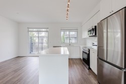 RARE OPPORTUNITY!! PRIME LOCATION! Just like brand new CORNER townhouse with 3 bedrooms + 1 den & 2 full& half bathrooms! Open concept main floor with modern kitchen granite countertops, an unobstructed island, dining room and living room offering access to a huge balcony. Master bedroom for a king size bed , walk in closet and private ensuite with a double vanity & oversized shower on the upper level. Conveniently located right in front of William F. Davidson Elementary, Johnston Heights Secondary with IB program, Lionel Courchene Park, Guildford Mall, you can walk to T&T Supermarket, Walmart, Guildford Mall, restaurants, banks, and a recreation centre. Enjoy quick and easy access to Highway 1. Fenced & gated front yard & Double garage with EV installed.