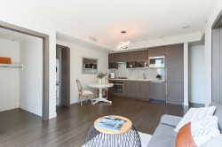 This exceptional 550 sqft 1 bed+den, air-conditioned unit offers a versatile layout. Designed with high-end finishes, this home includes in-suite laundry and a gourmet kitchen equipped with premium appliances and elegant stone countertops. Enjoy serene courtyard, water, and pool views from your private retreat, while benefiting from five-star building amenities, including concierge service and hotel-style conveniences. A perfect blend of sophistication, comfort, and functionality in one of Vancouver’s most sought-after addresses.