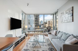 ALVAR - your front row seat to English Bay beauty and serenity. This west exposure, 2 bed + den, 2 bath home features a functional and efficient floorplan, punctuated by over-height ceilings and expansive windows inviting city and water views. Appreciate an entertainment sized kitchen with island seating, plenty of cabinetry, and sleek appliances, all flowing into the open-concept dining and living rooms. The principal suite is generous in size and the ensuite features a soaker tub and contemporary finishes. Central air-conditioning and a covered patio for year round enjoyment and comfort. Building amenities include fitness centre, outdoor terrace, party and meeting room. But the best amenity is at your doorstep... ***OPEN HOUSE SAT & SUN SEPT 13 & 14, 2-4PM***