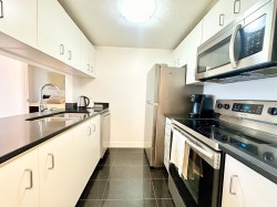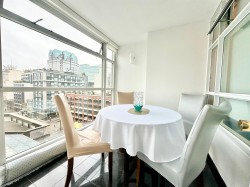 Located in the heart of Downtown, this furnished pristine 2 bedroom and 2 bathroom suite at the Conference Plaza spells charisma. Being East facing, it lightens up with the early morning sun rays. The white, black and brown color combination along with hardwood floors add a touch of class to this unit. With easy access to seawall, you'll find yourself enjoying the beauty of BC often. As you walk in to the suite, a plush white sectional couch invites you to relax and enjoy your favorite series on the flat screen TV with basic cable. A large white rimmed window lets natural light to flow in. During winters, you can enjoy city views while curling up on the couch. Right across from the living area is the enclosed galley kitchen.