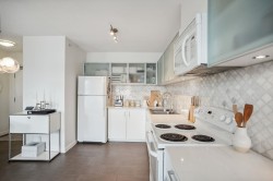 Beautiful one-bedroom home in the heart of GASTOWN! located in a boutique concrete building by Westbank. This stylish, move-in-ready unit features soaring over-height ceilings, large format tile floor, fresh paint throughout, and a thoughtfully designed layout that maximizes space and natural light. Enjoy peekaboo WATER-VIEWS and contemporary finishes, with interiors professionally styled by Inform Interiors for a modern, sophisticated feel. The building offers outstanding amenities including a rooftop patio with panoramic views, BBQ area, gym, party room with kitchen, and secure bike storage. Pet-friendly with a storage locker included; parking available for lease through EasyPark. Ideally situated just steps from Waterfront and Stadium SkyTrain stations, the SeaBus, Rogers Arena, Costco.