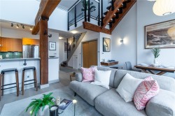COOLEST LOFT IN YYJ! Experience urban living at The Vogue, a premier steel & concrete heritage conversion in Old Town Victoria. Luxury Heritage Loft featuring 21' ceilings, exposed old-growth beams, brick feature wall & floor-to-ceiling windows w Hunter Douglas remote sheers & blackouts ($7,500 value). Gourmet kitchen w custom cabinetry, stone counter, glass subway tile backsplash & high-end Euro appliances—Bosch D/W ($2,500), Blomberg gas stove ($4,000), Blomberg fridge ($3,000), premium sink & fixtures ($2,000). The open living space is anchored by a new Valor gas FP (2025, $7,500 value) w/ custom tile. Custom lighting ($5K), custom bath cabinetry ($8K), built-in desk ($2,500), in-suite laundry & radiant flrs throughout. Spacious loft w 11' ceilings fits king bed + furniture, w ensuite -convert back to shower. 17' balcony w irrigation. 1 secure parking + storage unit. Steps to shops, cafés, dining & transit. Over $77K in upgrades! Own a luxury loft in a prime heritage conversion!