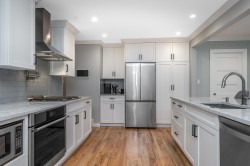 A flawless, fully renovated White Rock rancher. Located on a peaceful street just 30 seconds from Peace Arch Elementary. This stunning 3-bedroom, 2-bathroom home has been transformed with meticulous attention to detail. Original hardwood floors. Open-concept layout flooded with natural light. Stunning chef’s kitchen: dramatic quartz countertops, shimmering glass backsplash, new premium appliances, professional gas range, wall-mounted pot filler, and a huge walk-in pantry with upright freezer and water line. Spa-like main bathroom with freestanding soaker tub + oversized custom glass shower. Ensuite with sleek floating cabinets, dual sinks, and luxurious shower. Huge wraparound deck overlooks a large private yard. New high efficiency furnace, on-demand hot water and EV charger. O/H SUN 2-4.