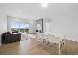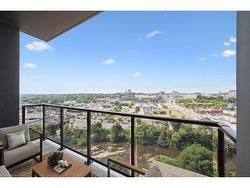 This stunning and spacious 1,295 sq.ft. interior + 80 sq. ft. private balcony, 2-bedroom, 2-bathroom condo- facing the Speed River and steps to downtown Guelph- offers an exceptional combination of luxury and convenience. The bright, open-concept layout is thoughtfully designed for accessibility and showcases luxury finishes including white oak hardwood flooring throughout, 9-foot ceilings, a remote controlled fireplace in the living room, and a designer kitchen flaunting a waterfall quartz island, quartz countertops, full-height backsplash, LED under-cabinet lighting, soft-close drawers, high-end stainless-steel appliances, and a spacious pantry. An abundance of natural light pours through the large windows- complete with roll-up shades for privacy- while the private balcony offers stunning, unobstructed views of the river. The primary suite boasts a generous walk-in closet and a spa-inspired 5-piece ensuite, complete with a freestanding soaker tub and an oversized glass shower. A second bedroom is thoughtfully positioned on the opposite side of the unit, and is conveniently located near a stylish 3-piece bathroom and the in-suite laundry. This condo also includes a secured underground parking space for your comfort and peace of mind. The well-maintained building offers incredible amenities including a gym, guest suite, golf simulator, billiards, a lounge with a library, a second lounge bar with terrace, an outdoor dining terrace and BBQ area, indoor visitor parking, secured bike rooms on all parking levels, and a welcoming community where neighbours truly look out for one another. Just steps away from restaurants, cafés, shops, Market Fresh, the Farmer's Market, the VIA Rail/ GO train and bus stations, and within easy access to riverside trails. This condo delivers the ultimate lifestyle in one of Guelph's most desirable locations.