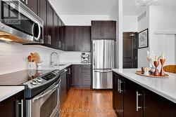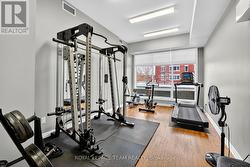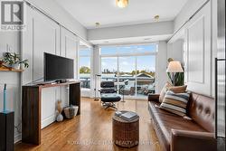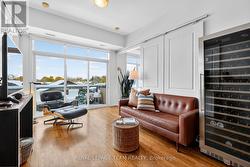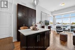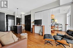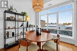 Penthouse living has its advantages in this rarely offered 2-bedroom, 2-full-bath Westboro condo with a flexible layout. Perched above the rooftops and treetops on the quiet side of the building, this condo offers light, privacy, and an airy sense of space with nearly 10' ceilings and a wall of floor-to-ceiling windows. Move right in-fresh white walls, warm hardwood floors, and custom blinds throughout. The kitchen and dining area feature quartz countertops, a chic backsplash, stainless appliances, and a bonus bank of pantry cupboards surrounding a fabulous eat-at island. The open living space flows seamlessly to a private 20' west-facing balcony-perfect for summer dining and sunset views. The brilliant plan includes two private bedroom zones, each with sliding-door access: the primary easily accommodates a king bed and offers double closets plus a 5-piece ensuite with double vanity. The second bedroom doubles beautifully as a guest suite, office, or formal dining area. Two photos have been virtually staged to show design and decor options. Additional features include in-unit laundry with storage, underground parking in a heated garage, storage locker, fitness room, and visitor parking. Steps to Westboro's shops, cafés, and transit, with the 417 moments away-effortless, elevated urban living awaits. (id:7525)