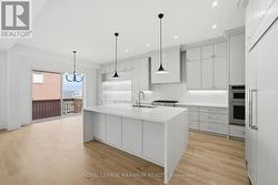 Stunning Vogue Homes inventory model tucked on a quiet child-safe court in the prestigious Thornhill Woods community. Approx. 4,485 sq.ft. of total finished living space (as per builder's plan), showcasing impeccable craftsmanship, upscale finishes, & thoughtful design including 5" hardwood floors & 12" x 24" tile floors throughout main & 2nd levels, 7 1/2" baseboards & 3 1/2" casement trim package, 10ft smooth ceilings on main floor with 8ft interior shaker style doors, 9ft smooth ceilings on second floor & 9ft smooth ceilings on walkout basement level. Upgraded light fixtures plus pot lights, Open oak staircase with iron pickets from basement to 2nd floor, crown moulding, coffered ceilings, & more! The main floor features principal rooms that include a gourmet kitchen with upgraded cabinetry, matching stone counters and backsplash, soft closing doors & drawers, built-in 6 burner gas cooktop, built-in oven/microwave combo, built in panelled fridge & panelled dishwasher, pull out recycle station & large centre island with breakfast bar. The open concept layout combines the kitchen with a large breakfast area with additional storage space in the form of an approx. 11ft long built-in cabinet with doors & open display shelves. The family room features coffered ceilings with crown moulding, a floor to ceiling focal fireplace wall with built-in display cabinets on either side, dining room with coffered ceilings & crown moulding, and Den with waffled ceilings and crown moulding. The second floor has 4 practical size bedrooms (each with private ensuite with granite counters & undermount sinks) + media room that could serve other purposes, and full size laundry room. Primary bedroom features large walk-in closet and 5pc ensuite with free-standing tub, double sink vanity & frameless clear glass shower. Finished walkout basement has a considerable sized 27ft x 16ft recreation room, plus a 4pc bathroom. Temporary partition wall inside garage will be removed prior to clo (id:7525)